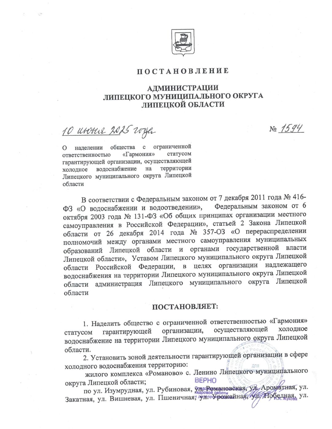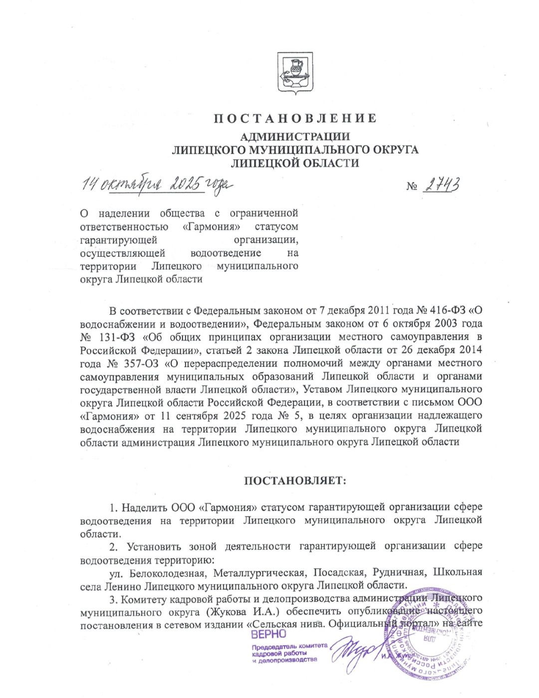 ООО «Гармония» является гарантирующей организацией в сфере водоснабжения и водоотведения на территории с.Ленино Липецкого муниципального округа Липецкой области